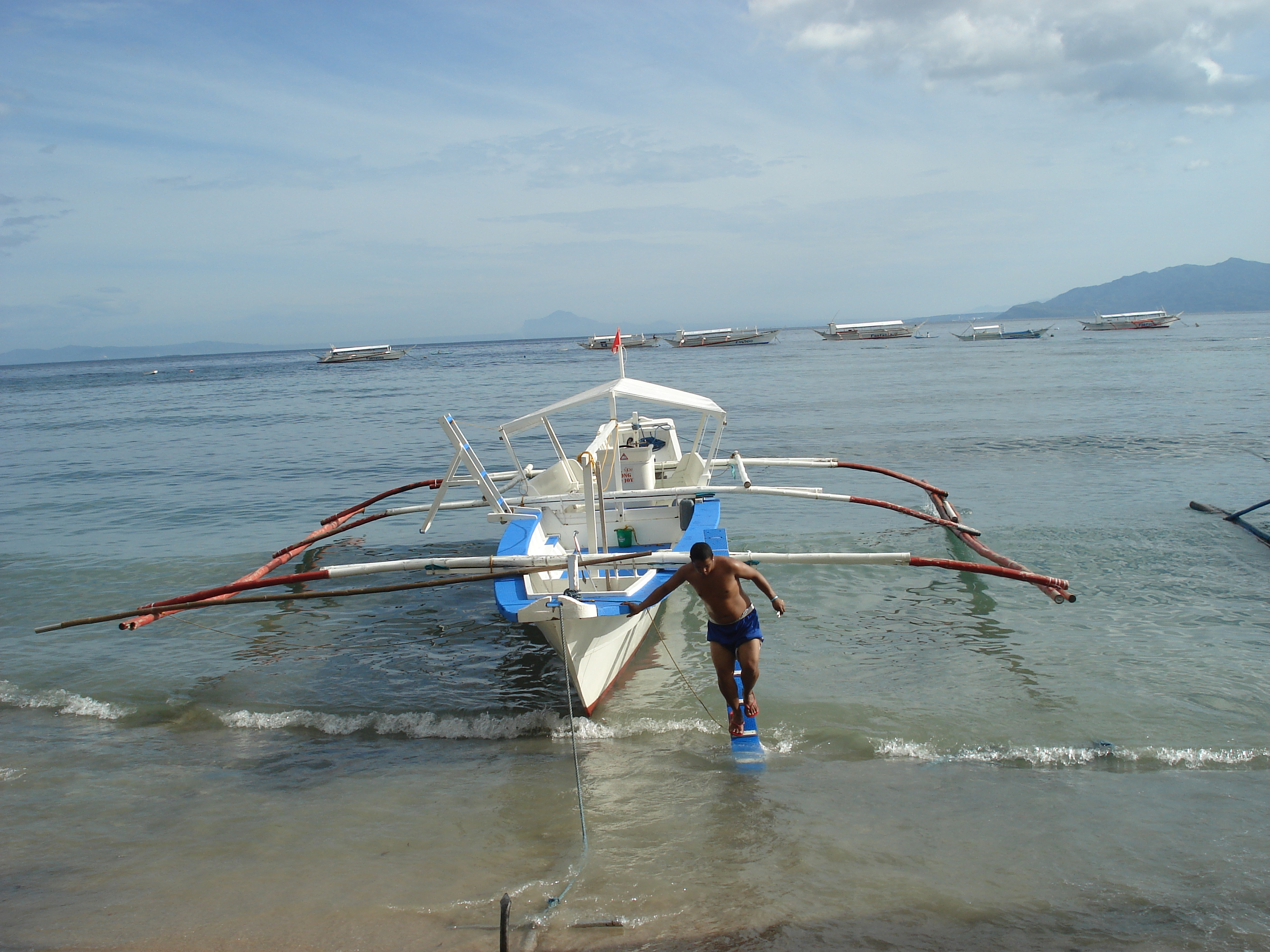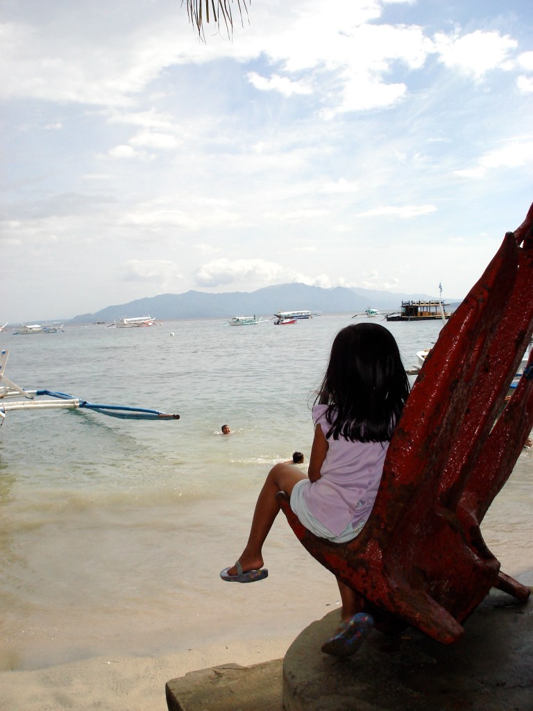 When we got to Batangas, we hopped onto a ‘banca’, a traditional Philippino boat, sort of like a pirogue but with these bamboo supports on the side. One of the boat boys, Jonas, chatted with us on the way, telling us about life in Puerto Galera. The ride was unbearably rough — even me with an iron stomach felt a bit seasick. The tides were changing, and the currents were strong. The banca pushed on, and we could see Mindoro in the distance, but it never seemed to get closer!