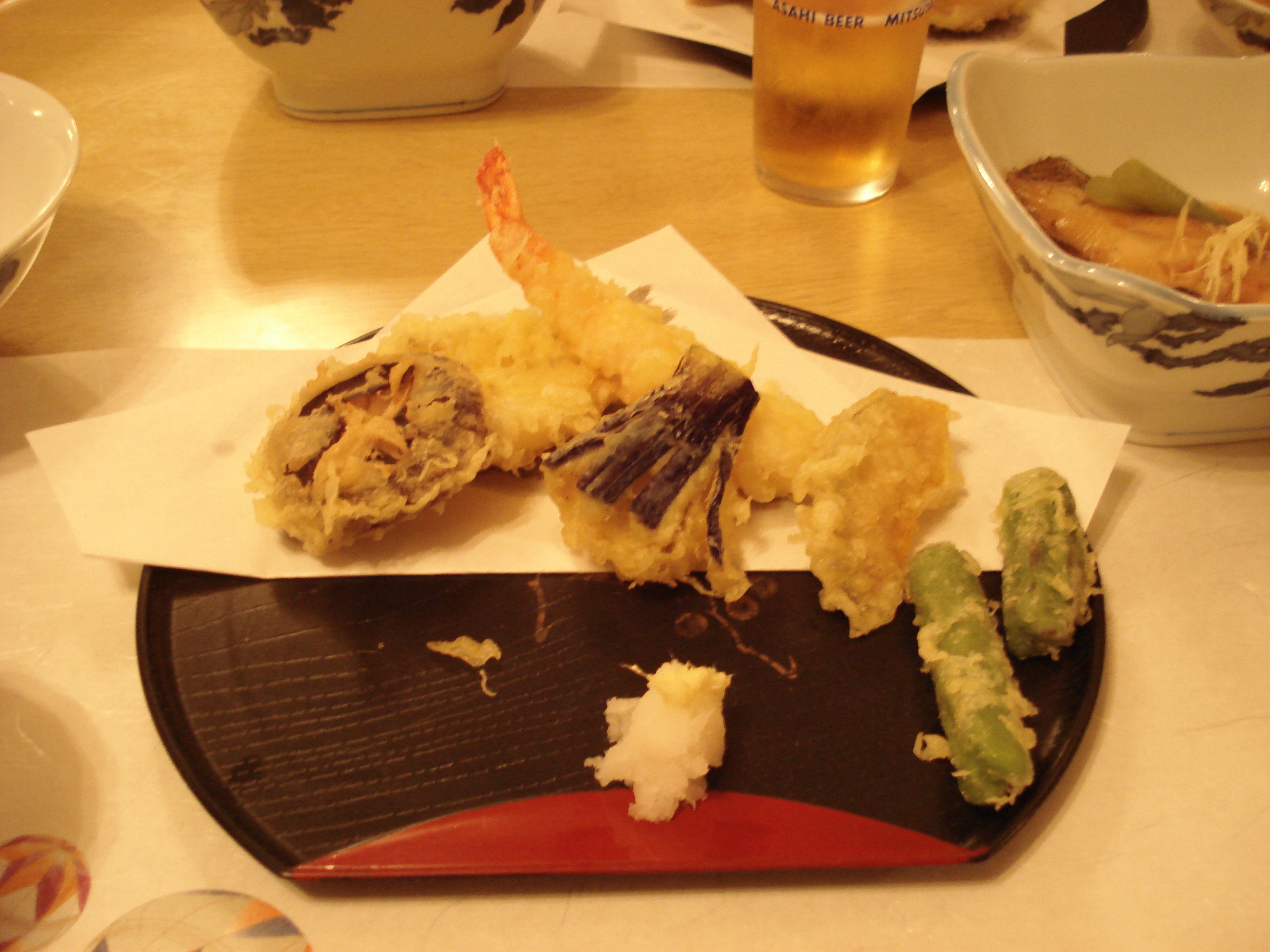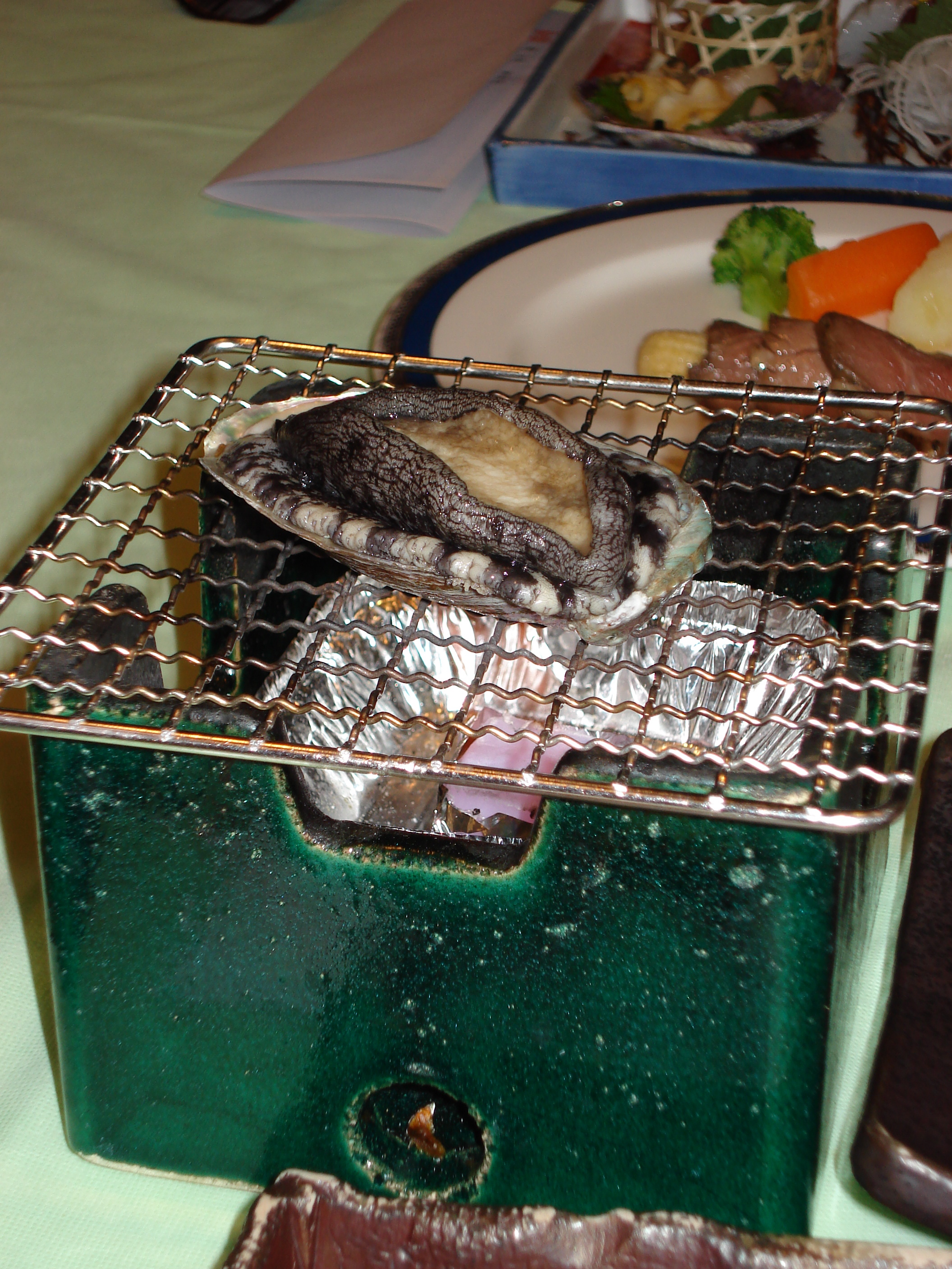 Suddenly, I realised that the huge abalone that was sitting, in its shell, on the grill, was still alive! It started moving and squirming, and I came to the grim realisation that we were going to cook it alive. The waiter came and with a flourish lit the candle. The abalone began to move and writhe even more as its shell heated up. It didn’t take long to die but I have to say the smell of the roasting shell and of the cooking process really raised my eyebrows. Apparently in Japanese this style of cooking is called ‘o-dori gui’, which means ‘dancing festival’. Ha! Gross.