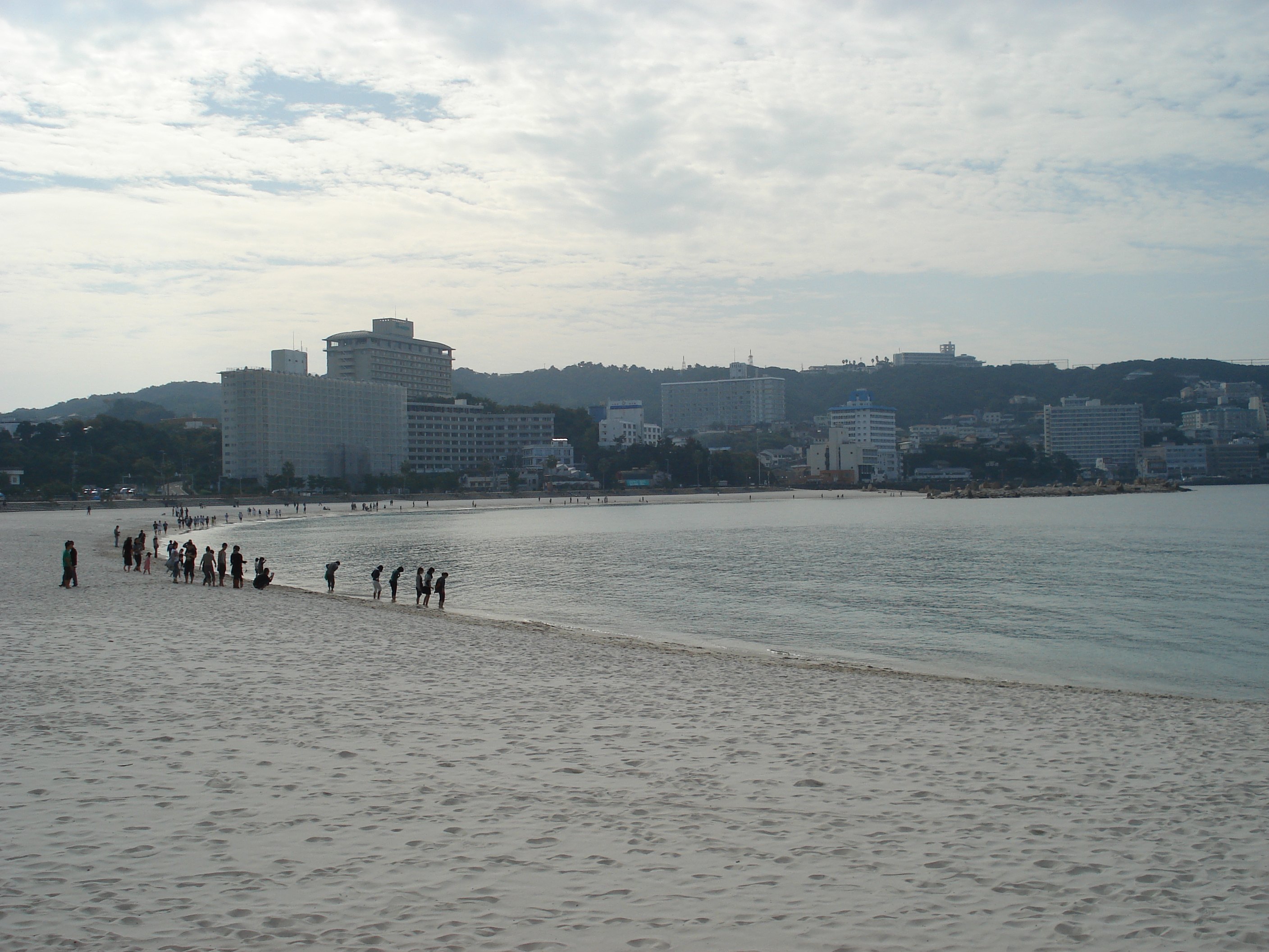 We flew from Hong Kong to Osaka at the crack of dawn on a very ghetto Air India flight, and from there began our journey south to the Wakayama coastline by train. As Osaka faded into the distance behind us, we began to wind our way through the mountains and along rivers towards Shirahama. A spa town, Shirahama is famous for clean, blue seas, white beaches, fishing, rock formations, and onsen, or mineral hot springs. We arrived in early afternoon, and checked into our small hotel, the Bay Lily. Nothing fancy, but it was fine. Nice clean rooms, tatami mats, etc. Walking distance into the town and the beach, which was lovely.