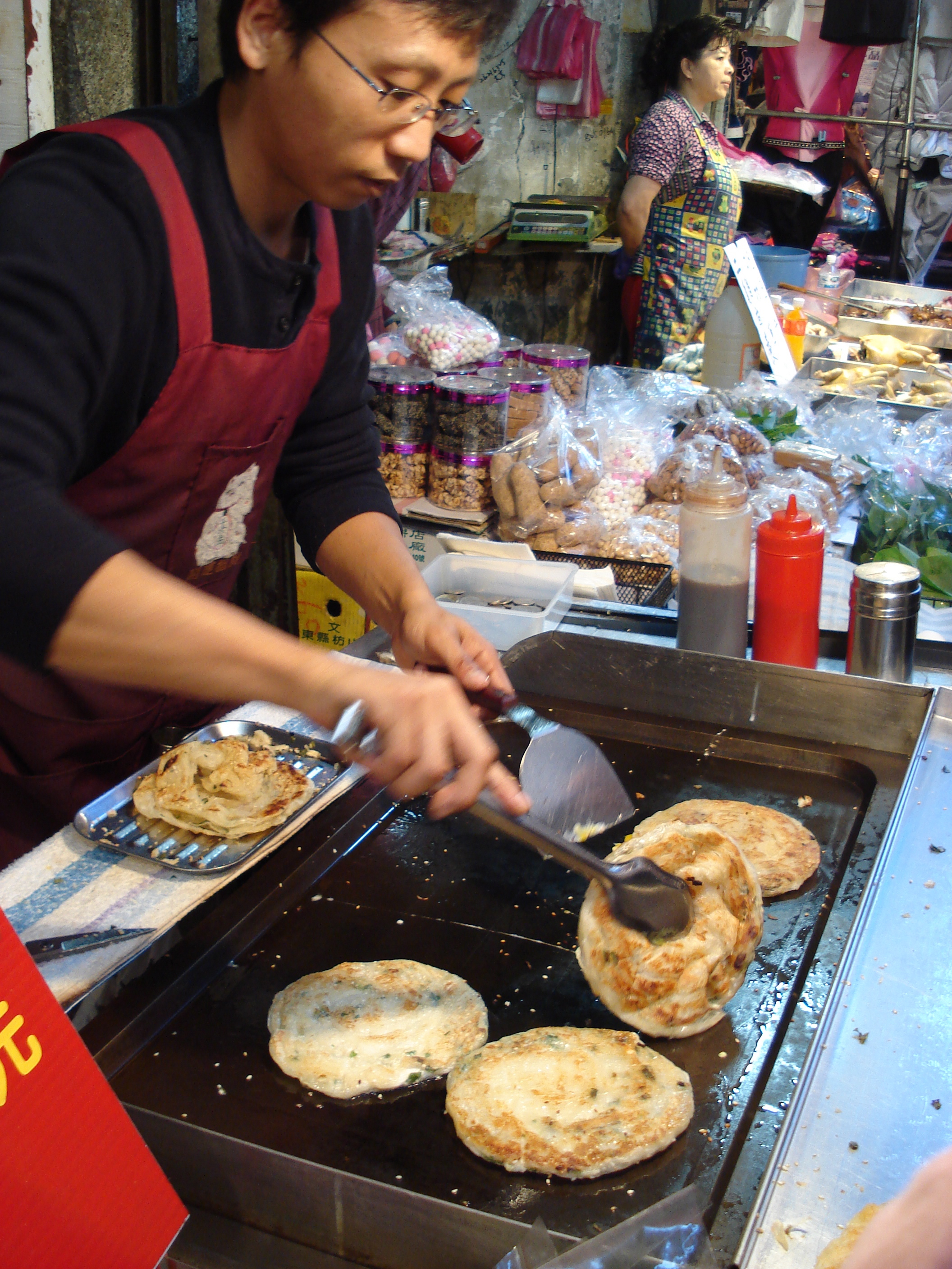 My favourite street food was a simple dish called dan bing: a sort of flatbread, almost the texture of roti paratha, infused with little green herbs, grilled on top of a scrambled egg, doused with a bit of red chilli paste, and folded in half. I ate one of these every day. Late one afternoon after visiting the famous Confucius Temple in Shilin, I wandered around looking at the various snacks, and got in line at one of the stalls. A young Taiwanese guy, about 15 years old, came up to me and said in a perfect southern accent, “Ma’am? May I recommend that you try this one instead? This is the real deal, I promise you. Come on, switch lines. You gotta try to this China Pizza.” He turned out to be an American born Taiwanese who grew up in Tennessee, which would explain why he called me “ma’am”. And he was right, the flatbread was incredible, soft and crispy, juicy and spicy. I sat down on a bench in the warm sunshine, watched the people go by, and munched on it, happy as a pig in mud. In fact, I must have looked pretty damn happy — the locals who were passing by kept smiling at me.