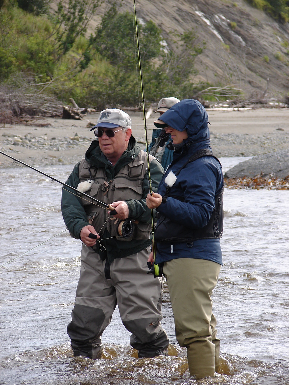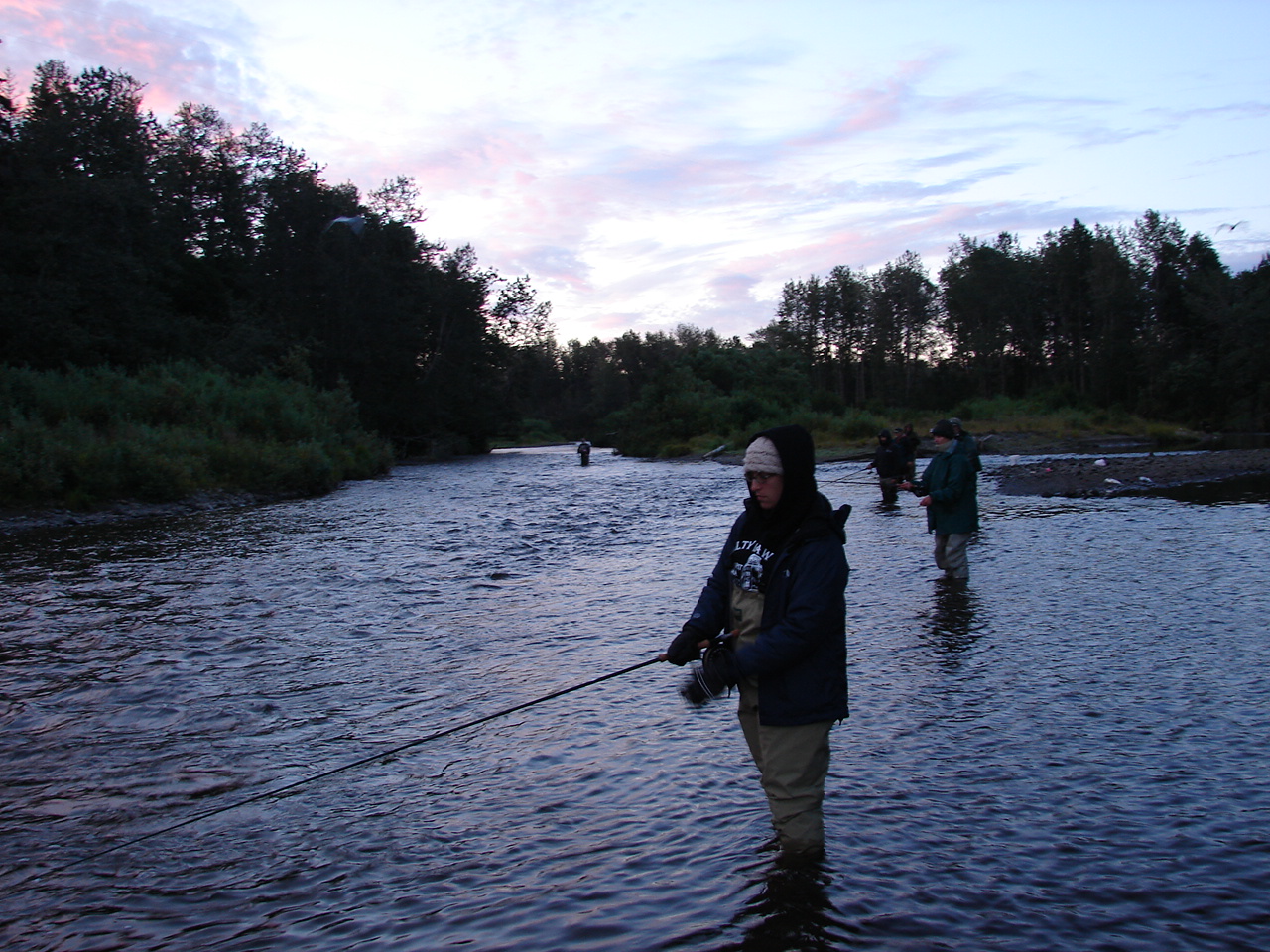 On the first morning we awoke at 4.45 to get to the fishing spot for the 5.15 rising tide. Despite the sleepiness and jet lag, I was excited to try my first Alaskan fly fishing. Wearing long johns, ski pants, and fishing waders, we were prepared for the cold darkness of the morning. We waddled quietly down the path to the river, using flashlights as our guide.