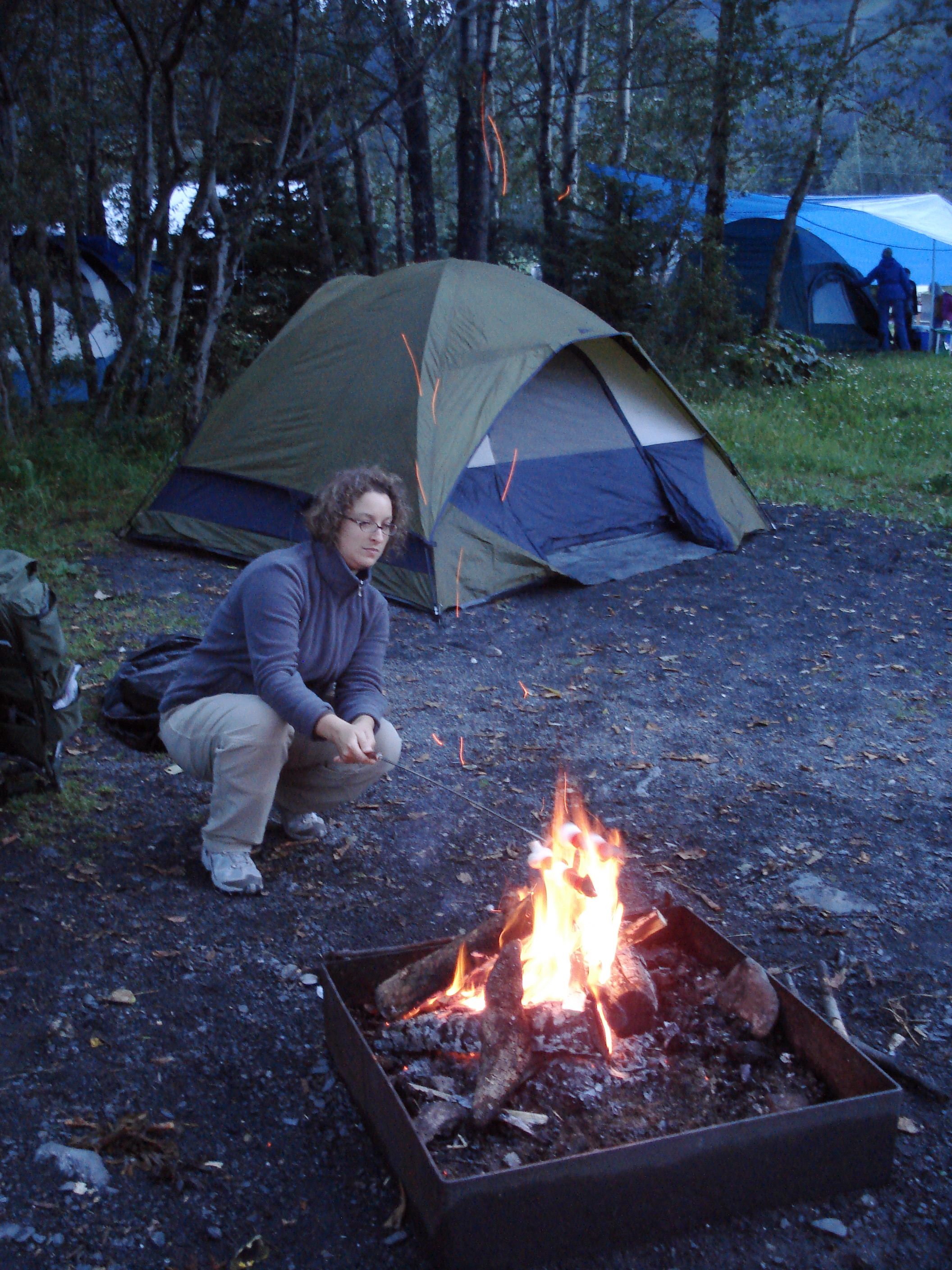 We set up our tent and tried our damndest to get the fire going. It was obvious to the other campers nearby that we were city slickers, so one of them very kindly came across to lend us his axe so we could cut the firewood into smaller pieces.