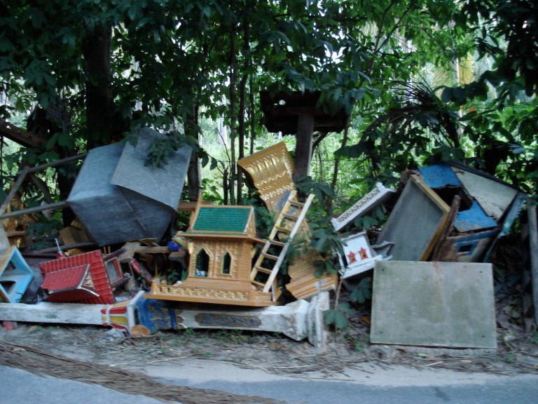 “Many people have asked about what happens to old spirit houses. When changes dictate that a new spirit house be created, a ceremony will be held to transfer the spirit from the old spirit house to the new. After that, the old spirit house can be discarded. Many are discarded near a temple or wat, but usually at a place where other spirit houses have been discarded. So it is common to see many old spirit houses jumbled together.”