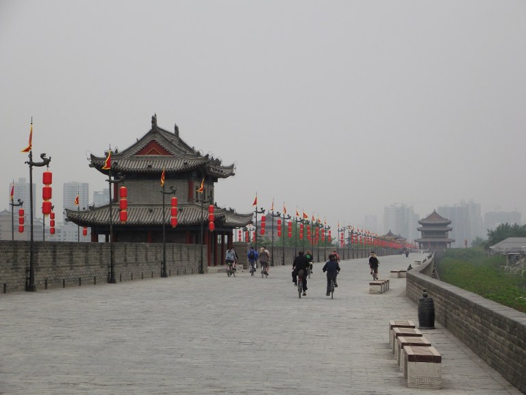 On my last day I did something which I thought was a particularly good attraction in Xi’an — biking along the city walls. Because Xi’an has an intact city wall, someone came up with the bright idea of renting out bikes to tourists. The entrance is at the South Gate of the city walls, you pay a small entrance fee, and the bicycle hire area is up on top. I ran into someone I had met at the hostel and we ended up cycling together. It took about 90 minutes, and the bike place rents the bikes out for 90 minutes, so I guess we went at a pretty average speed. A word of warning — the bikes are not in good condition and the wall is quite bumpy so the bikes take a real beating. Try a few of them before you choose your bike!
