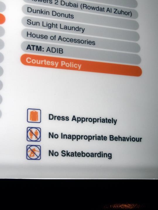 But on the topic of dress code, even though a lot of people here seem to do as they like and wear what they would back home, that doesn’t necessarily mean that it is considered kosher. When you go into the malls, they DO have signs asking you to please respect the local culture and dress appropriately. The picture I’ve posted above, which was in the mall, just asks you to cover your shoulders and knees. So simply put, no pum-pum shorts and spaghetti strap tops. Note it does not say ‘Women must wear a burka and walk four steps behind their husband or male relative’. I don’t think this basic request to dress respectfully (they even said please!) is such a big deal, to tell you the truth, as it is not that hard to follow. After all, in Paris, you can’t enter any of the big Cathedrals if you are dressed inappropriately. Even some museums in China have dress codes. I figure if I can respect that in other countries, I can respect that in Dubai.
