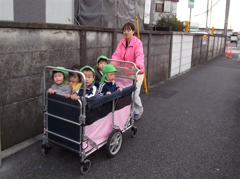 Special delivery! Coming soon to a home near you — babies in a buggy! A nearby daycare center actually drops these little suckers back home afterwards. Amazingly they put all the babies to stand up in the buggy, and push the buggy from house to house to deliver the babies. Amazingly all the kids just sort of stand there amazed at the journey, and I’ve never seen them crying or causing a fuss on the way home. And they certainly like to wave to people!