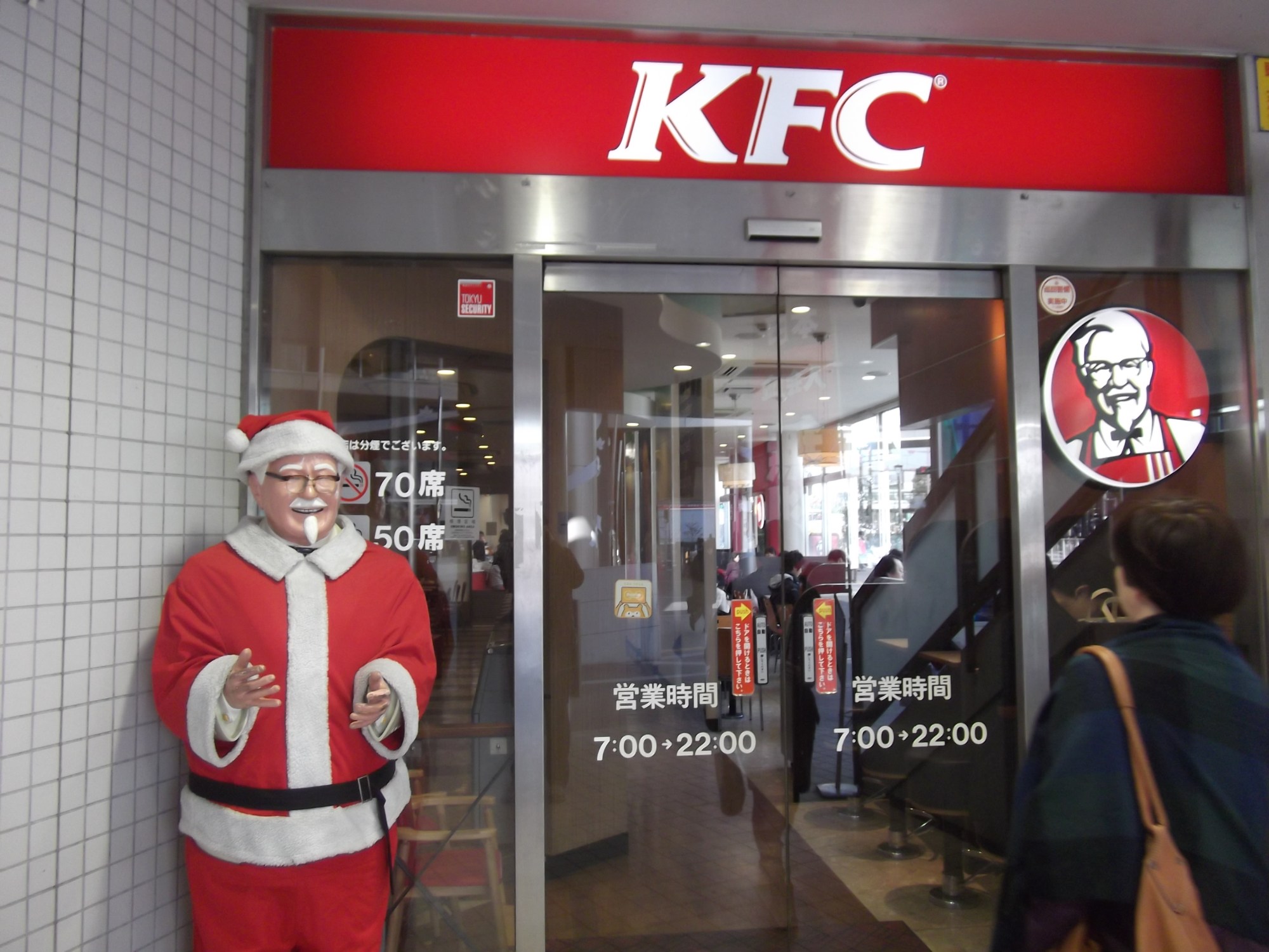 So who takes their date to a KFC fast food joint on Christmas Eve in Tokyo, and more importantly, why? According to my friend, it’s been that way since she was a child. “Kentucky for Christmas” is a well known slogan from an obviously successful advertising campaign over 30 years ago. In fact, KFC is synonymous with Christmas lunch/dinner. While in the Western world a baked whole chicken or turkey is traditional, in Japan very few people have ovens so baking a turkey is out of the question. After all, this is a land of rice and fish, not bread and ham.