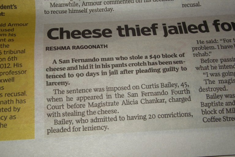 It’s such a simple pleasure, to sit on the front porch as the sun is rising, listening to the parrots making their morning flight, and reading whatever chupidness is in the newspaper. For example, this man with the cheese balls. Only in Trinidad, yes! Yesterday while driving I could not help but smile when I turned on the radio and heard the announcer say, “Dat is de onlyest problem”. Trinis have a very unique way of using English. I wonder what to call it… in Singapore they speak ‘Singlish’, and in Japan they speak ‘Engrish’… perhaps Trinis speak Tringlish?