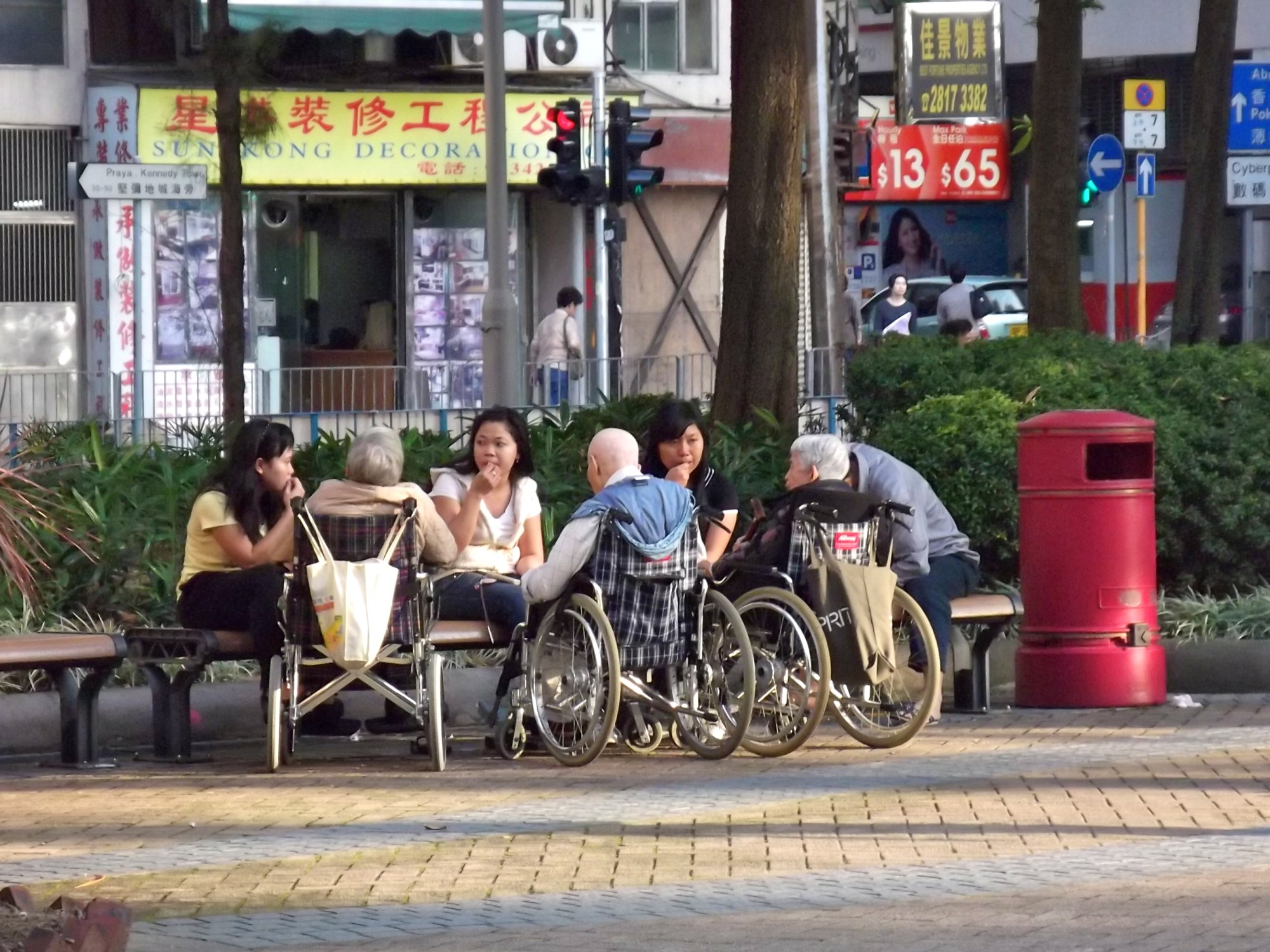 I caught this funny shot walking through a park the other day. It’s a group of Filipino domestic workers, with a group of wheelchair-bound elderly people. I would assume that the maids are supposed to be taking the elderly folks out for a walk. But instead they have parked up the old folks in a row, and are sitting around liming and eating snacks. I have a feeling that these old people probably cannot speak anymore, or they would surely tell their family, ha ha!
