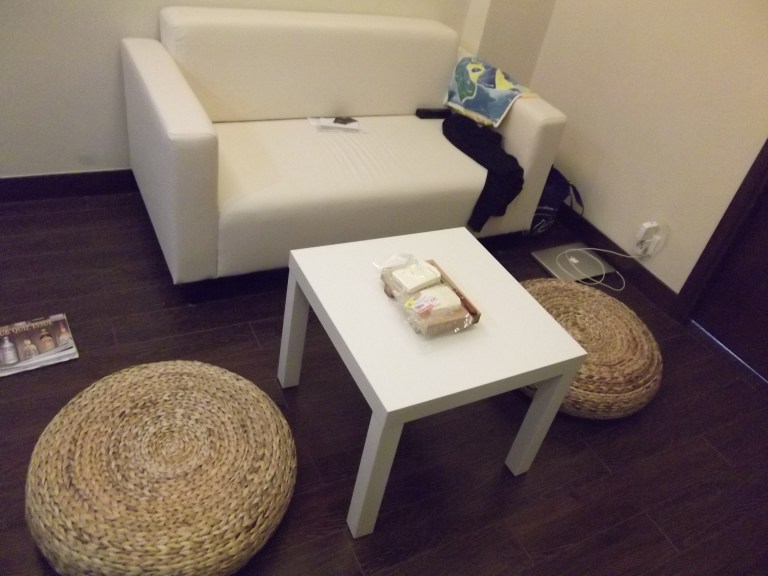 Since we don’t have room for a dining table, we instead got a sofa, a little coffee table, and two low seats which we can pull out and use whenever we need to sit to eat. It is surprisingly easy and convenient, actually. Plus, the getting up and down from the floor is good for the hips and flexibility!
