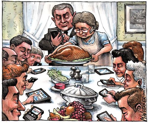 5. Families with bent heads. The other day I noticed a family sitting down at a lovely dinner in the clubhouse of a golf course, and instead of chatting, or conversing, or watching the beautiful sunset, every single family member, including the parents, was on their smartphone, heads down and fingers tapping. Good job, parents. And good luck communicating with your kids when they hit 14.