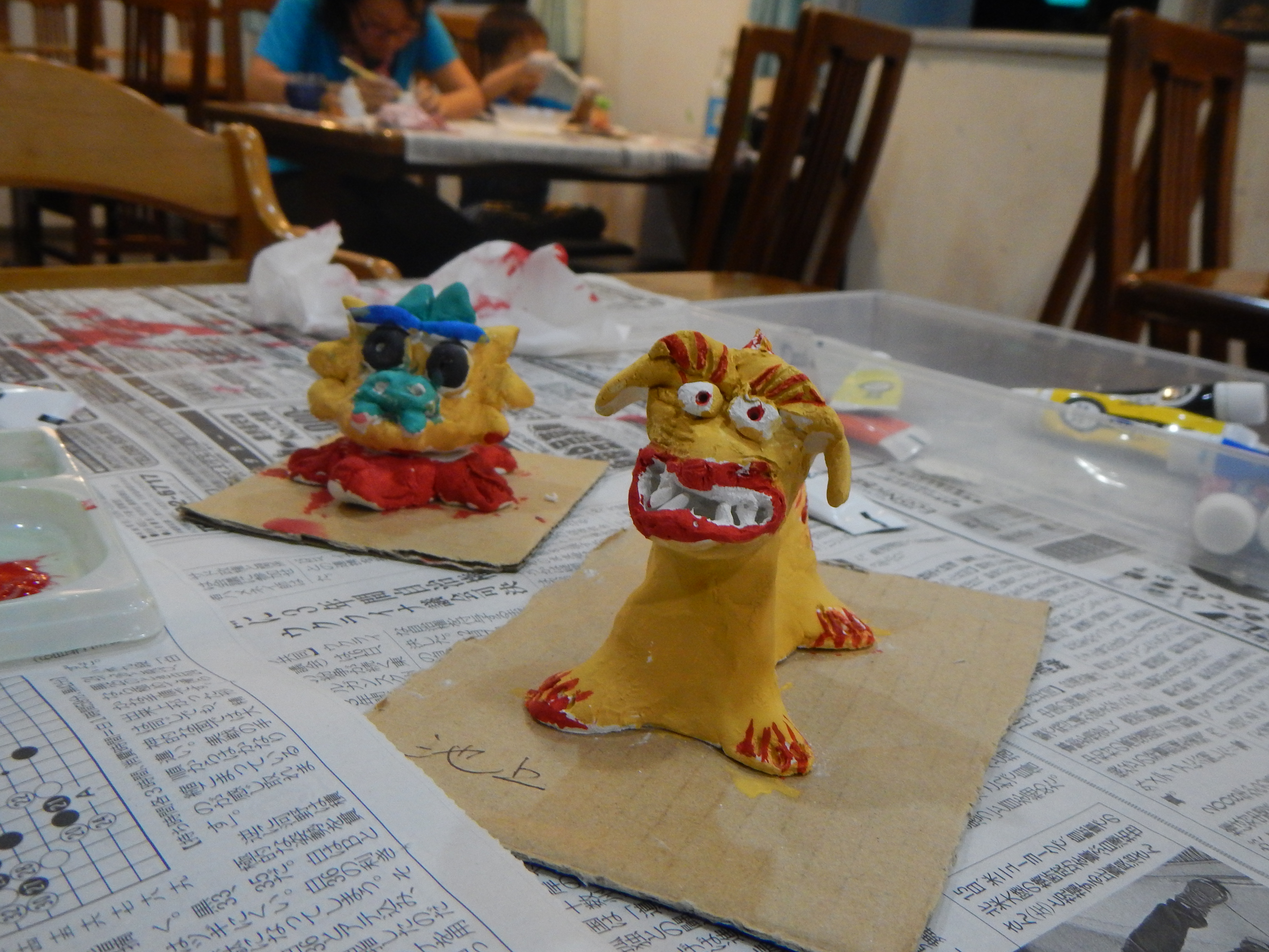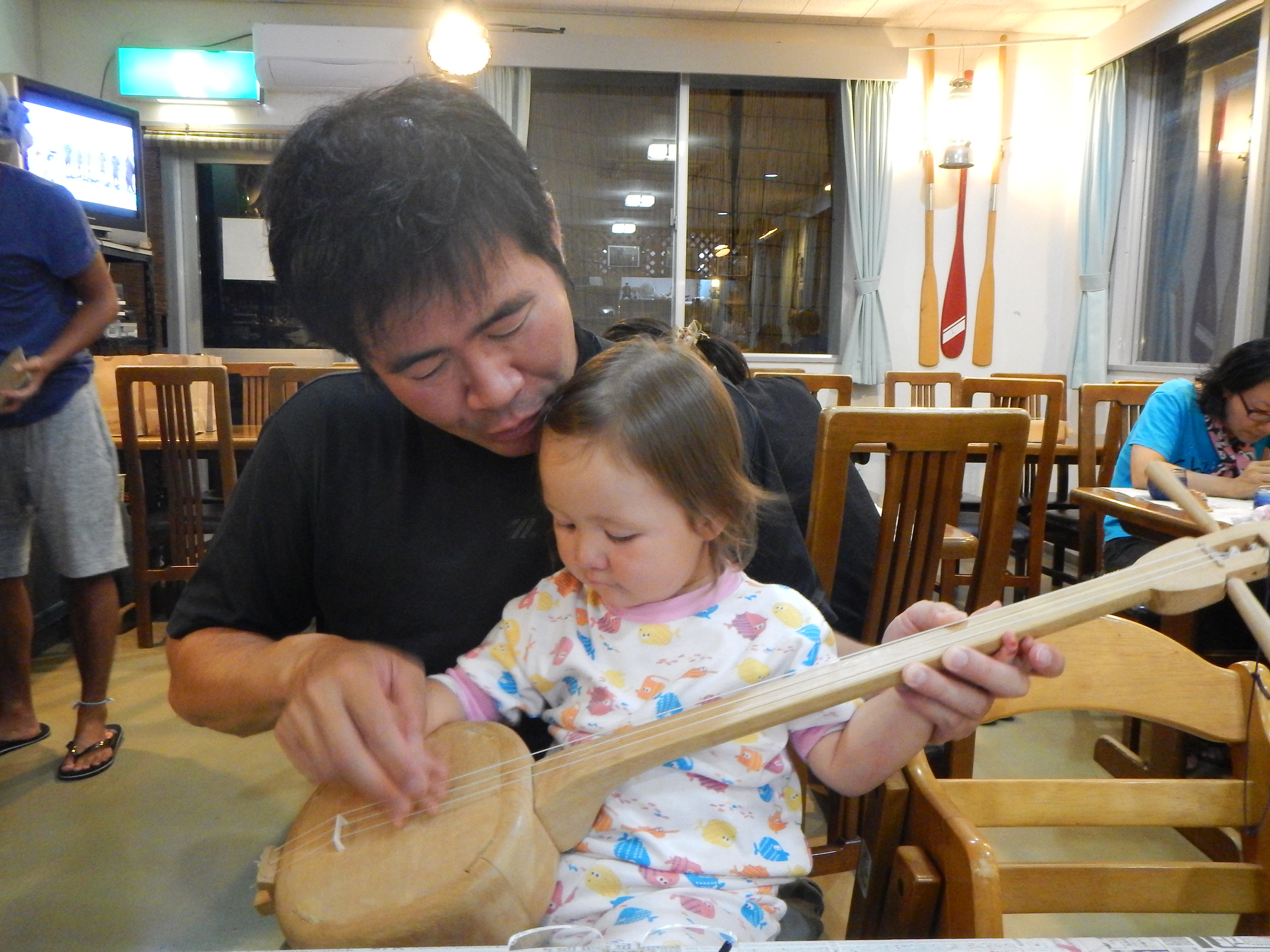 Motobu has loads of hotels, since the Churaumi Aquarium is in Motobu, but this time we took a chance and stayed at what is known in Japanese hotel terminology as a ‘pension’. Meaning that it’s cheap and a bit basic, but otherwise fine. Not the nicest place we’ve stayed, not by a long shot, but the owners of this budget stay offered all kinds of fun activities, like shisa making and learning how to play Okinawa’s native instrument, the three-stringed sanshin. Our shisa (the one on the right, in yellow and red) came out looking like a canine drag queen, but we took it home anyway, and it is now sitting on our window ledge, staring at us when we wash dishes.