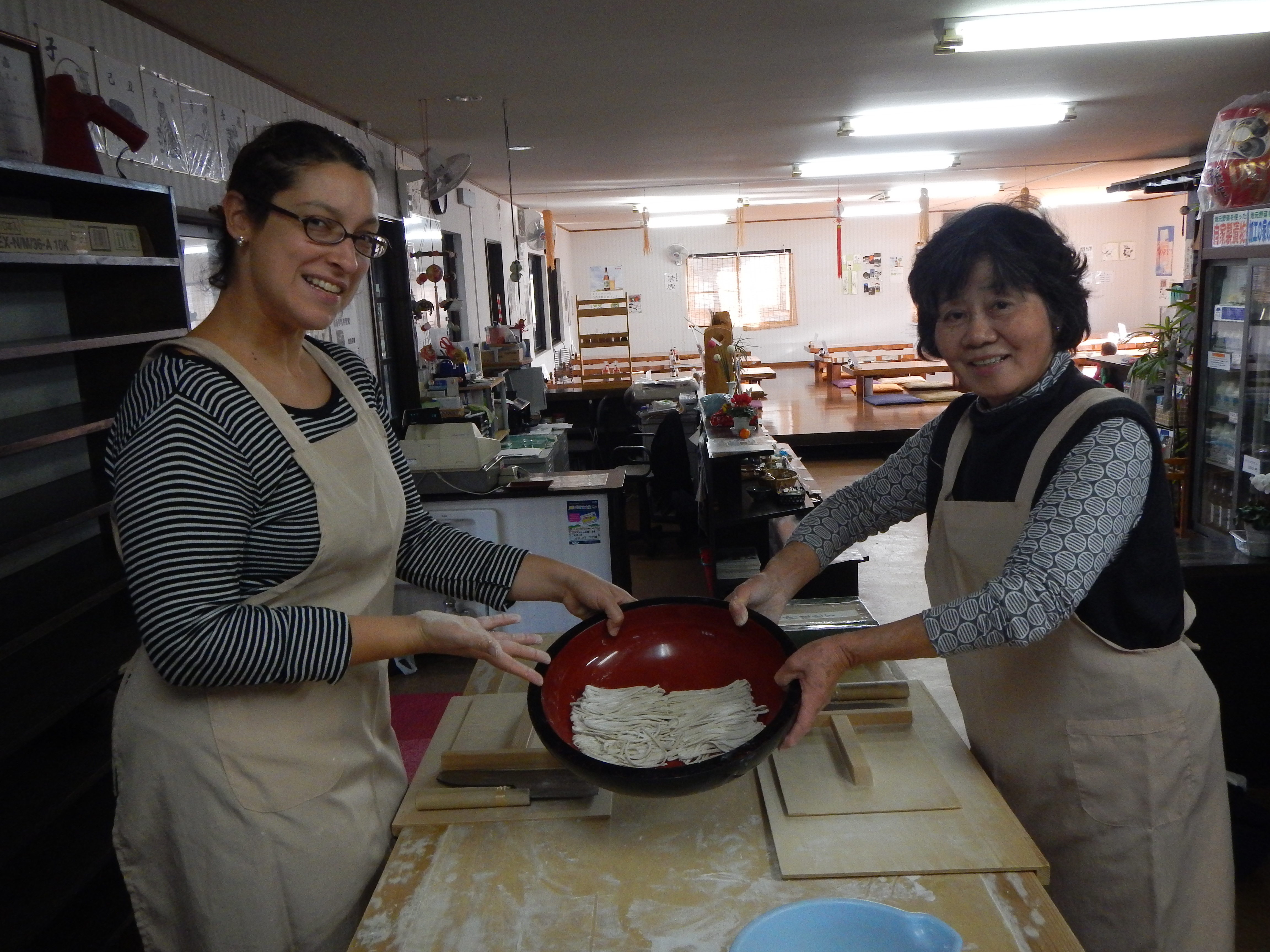 On the way there, we stopped at a Michi no Eki, or Roadside Station, to have a quick soba lunch and stretch our legs. My father-in-law, who knows the area, insisted I try my hand at making soba; a demonstration offered by the restaurants to lure in customers. A soft spoken woman showed us how to mix the buckwheat flour, knead it, roll it out, and cut into noodles. Then, our slightly wonky looking noodles were cooked and served to us.
