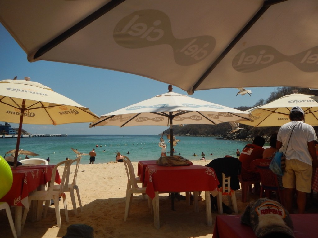 By then we were dying of heat, so we visited a nearby beach, Santa Cruz. The water here is not as good as that at Tangolunda bay, largely because of the huge dock which is built to accommodate the cruise ships. Santa Cruz has loads of beach front restaurants with food and cold cervezas, and the swimming was still pretty good.
