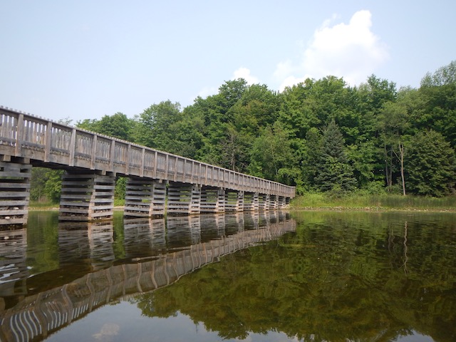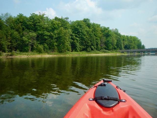 We headed out east (right) from the shore and paddled towards the north side of the lake to see the very scenic wooden bridges and boardwalks that connect the many small islands that comprise Island Lake. The water was a bit shallow that day so twice we got stuck on top of some logs and had to jiggle ourselves off! Close to the bridges is VERY shallow so be careful and try to navigate around the logs.