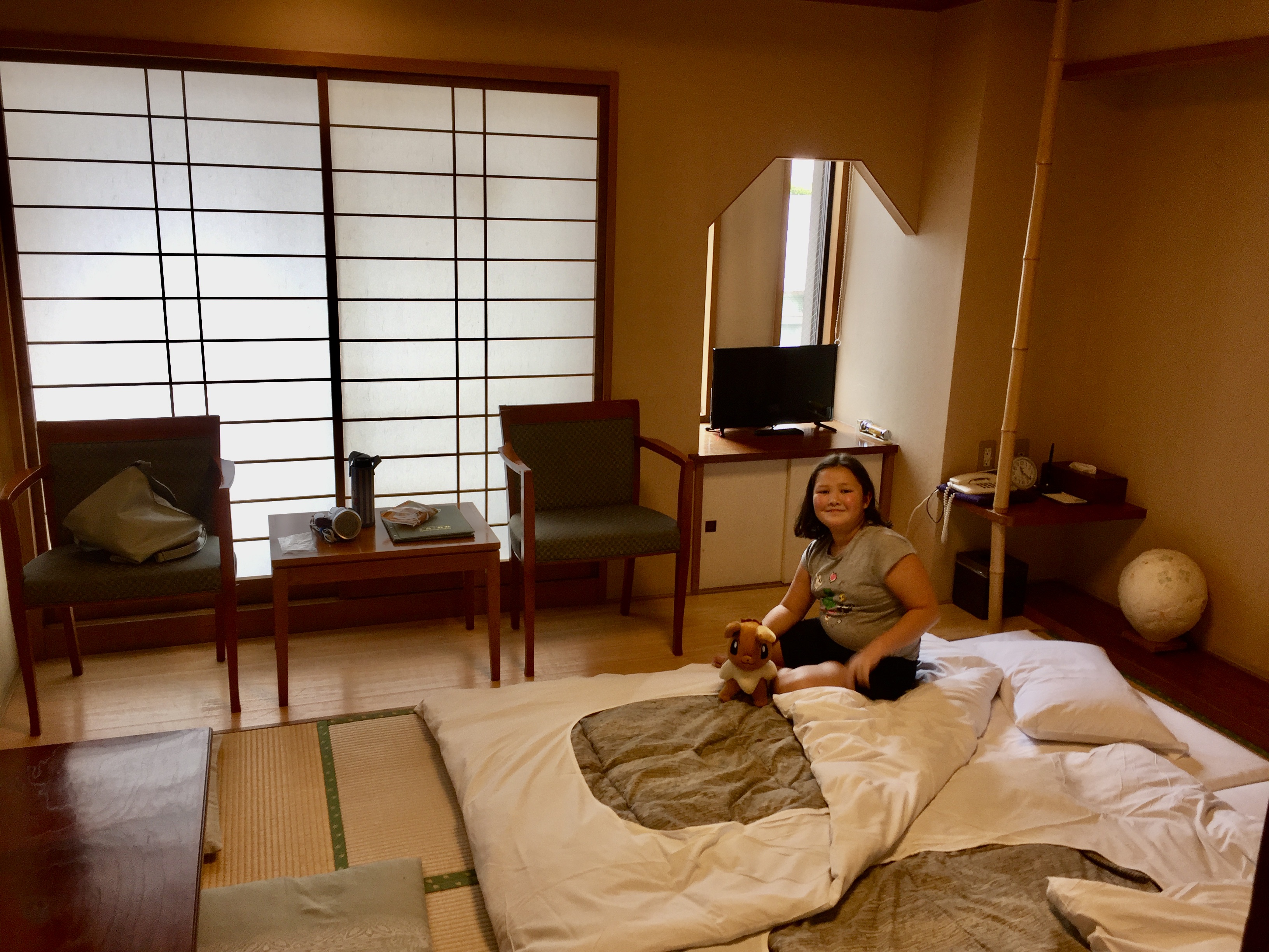 In a traditional ryokan you have a tatami room, and sleep on futon mattresses on top of the tatami. There are no curtains; only the classic paper-and-bamboo shoji sliding doors. There was a small table and two zabuton cushions to sit on. I love tatami rooms and it made me miss my old place in Japan!