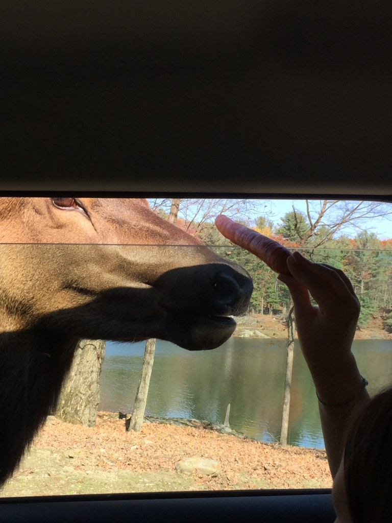 When you arrive at Parc Omega and pay your entrance fee (which is pricey but worth it, in my opinion, because you can spend HOURS here), you’ll reach a gate house with a souvenir shop, bathrooms, picnic tables, and bags of carrots for sale. Do yourself a favour and bring a few bags of carrots so you don’t have to pay tourist prices. It was 3 of us in the car so we brought 3 bags of carrots, which was more than enough to feed the wildlife. After having a toilet break, a quick snack and a stretch, we were ready for safari.