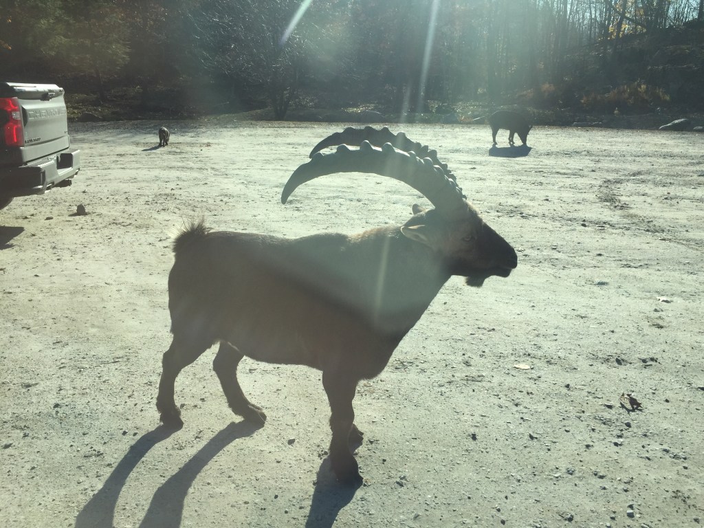 The star of the show are for sure the deer and elk. The wolves were mostly lounging in the sun and not doing much, the bears were sitting around rubbing their tummies, and the bison were hanging around eating. The only animals that truly approach your cars are the deer and elk (but they are still very cool), and the weird looking ibex which have a truly huge horn.